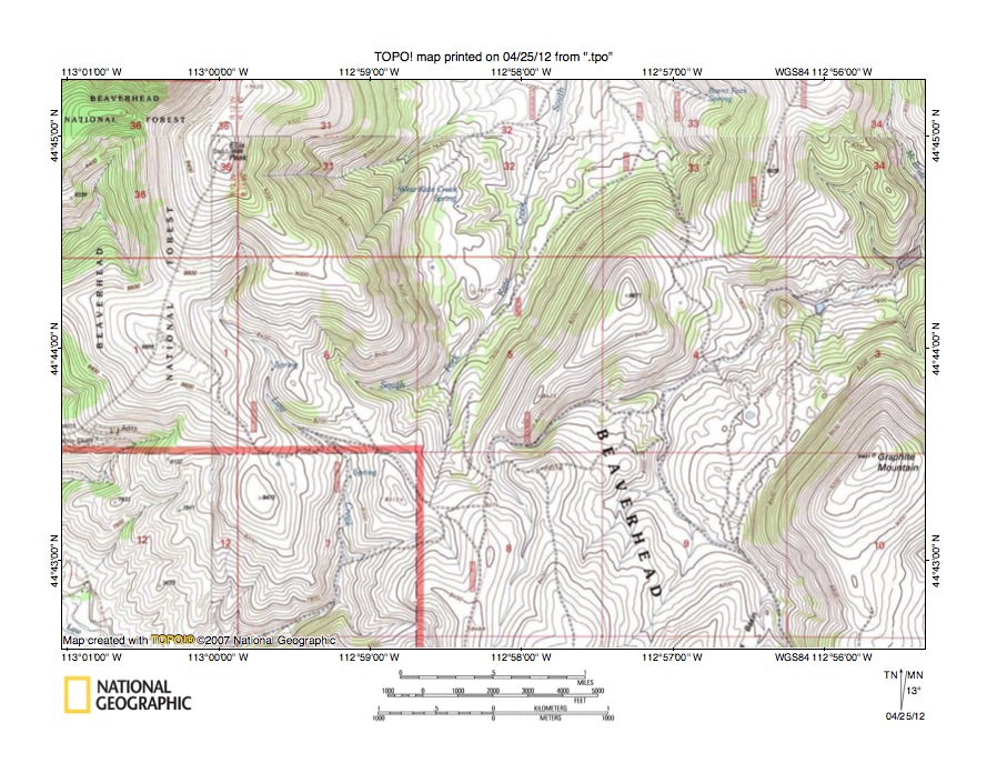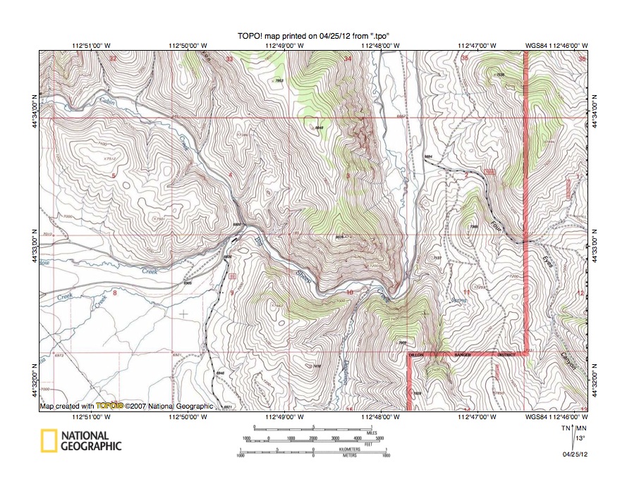 Figure 10: Detailed map of Cabin Creek-Big Sheep Creek drainage divide area. United States Geological Survey map digitally presented using National Geographic Society TOPO software.