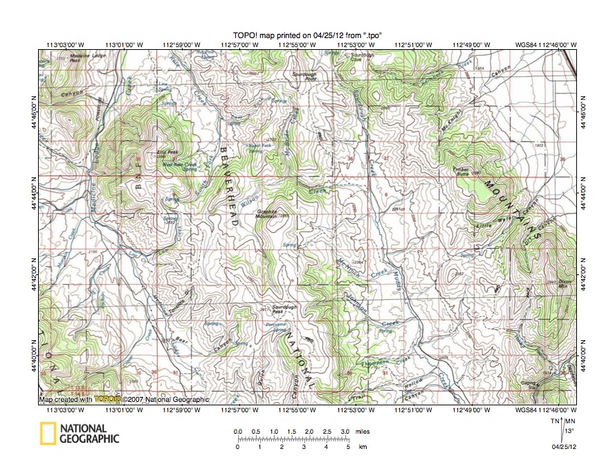 Figure 4: Detailed map of Medicine Lodge Creek-Sourdough Creek drainage divide area. United States Geological Survey map digitally presented using National Geographic Society TOPO software.
