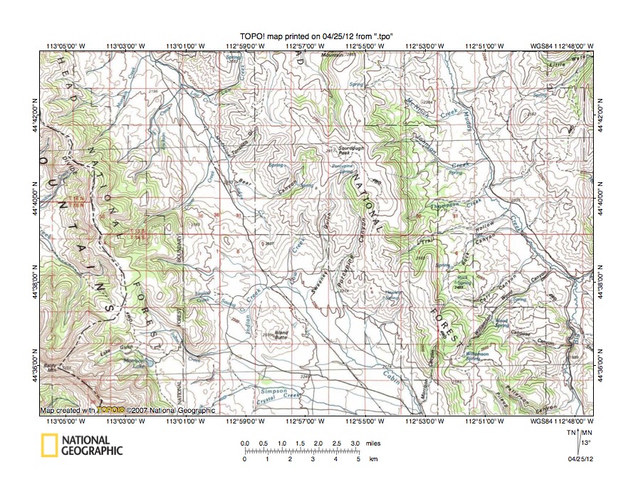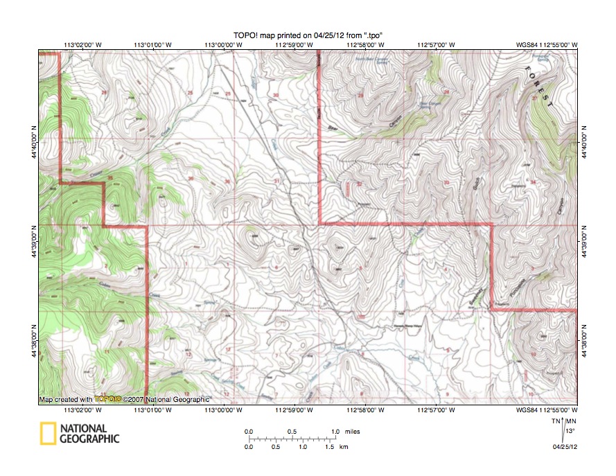 Figure 9: Big Sheep Creek-Little Sheep Creek drainage divide area. United States Geological Survey map digitally presented using National Geographic Society TOPO software.