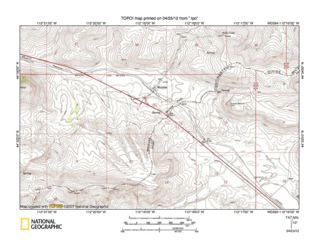 Figure 3: Cabin Creek-Divide Creek drainage divide area at Bannack Pass. United States Geological Survey map digitally presented using National Geographic Society TOPO software.