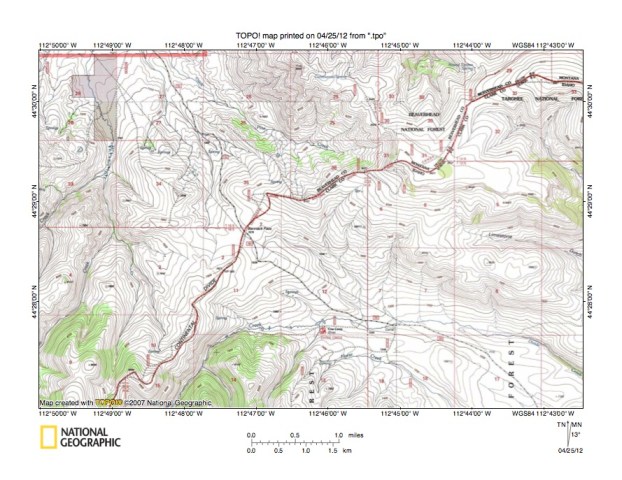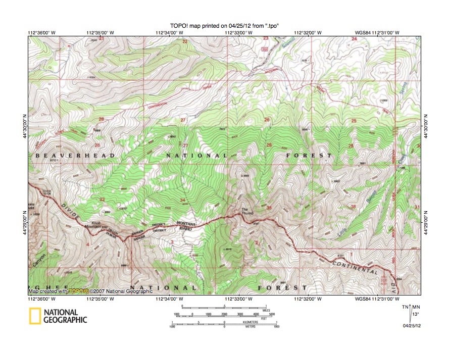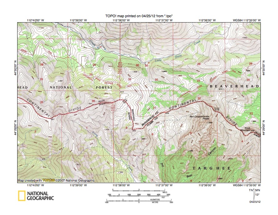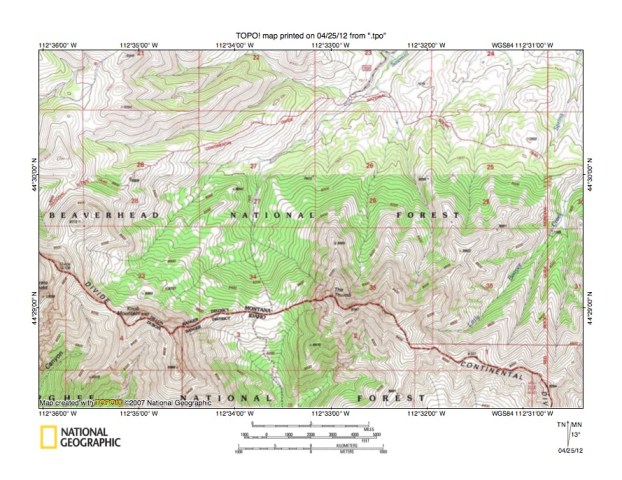 Figure 4: Detailed map of Deadman Creek-Divide Creek drainage divide area at Bannack Pass. United States Geological Survey map digitally presented using National Geographic Society TOPO software.