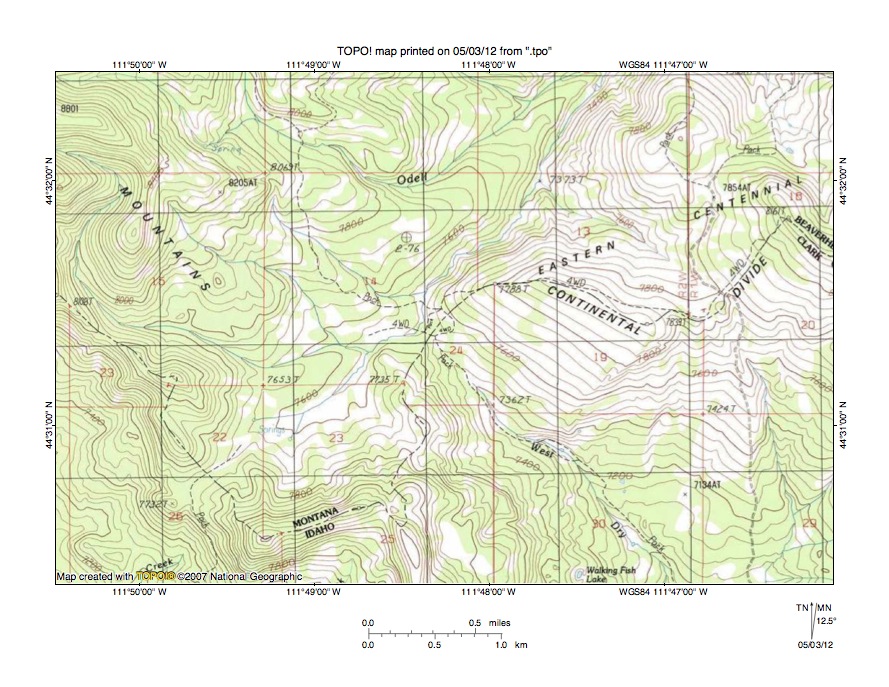 Figure 4: Detailed map of Odell Creek-West Dry Creek drainage divide area. United States Geological Survey map digitally presented using National Geographic Society TOPO software.