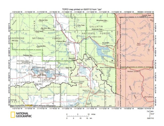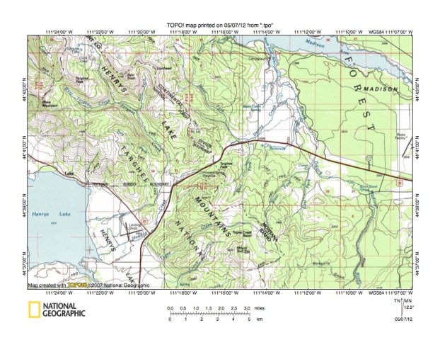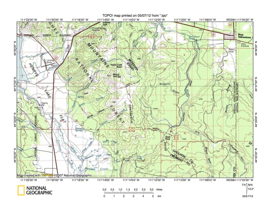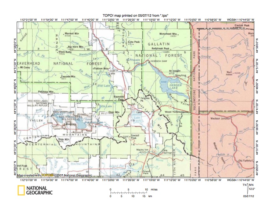 Figure 1: Madison River-Henrys Fork drainage divide area location map (select and click on maps to enlarge). National Geographic Society map digitally presented using National Geographic Society TOPO software.