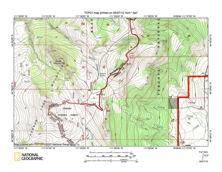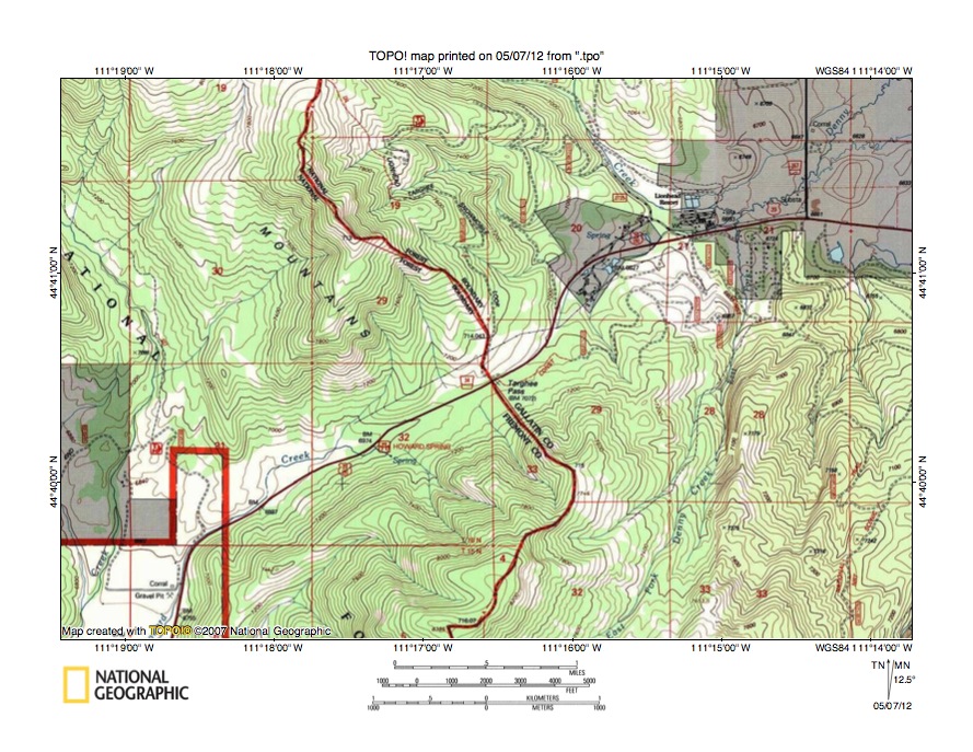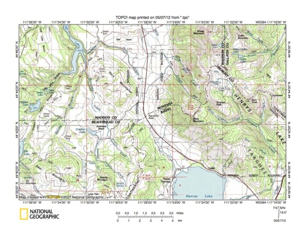 Figure 6: Detailed map of Horn Creek-Henrys Lake drainage divide area. United States Geological Survey map digitally presented using National Geographic Society TOPO software.