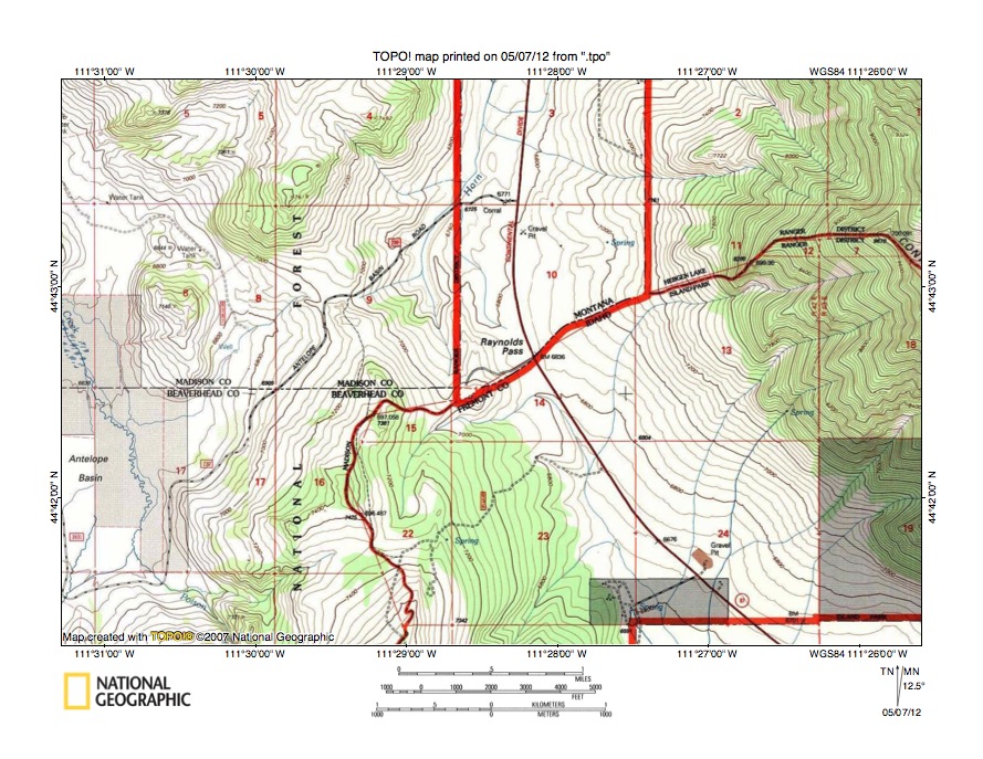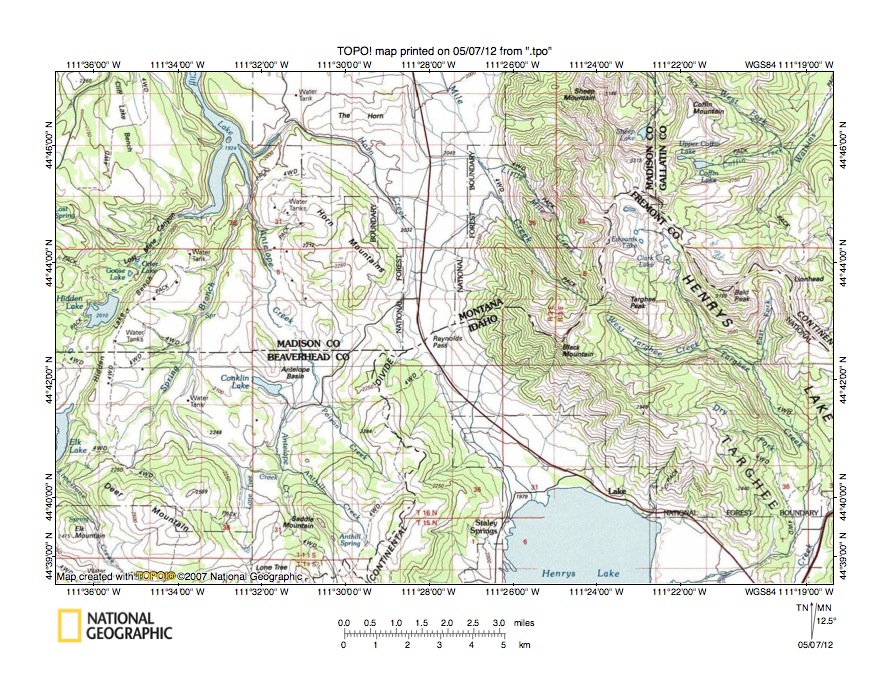 Figure 3: Antelope Creek-Henrys Lake drainage divide area. United States Geological Survey map digitally presented using National Geographic Society TOPO software.