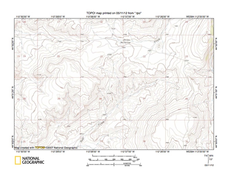 Figure 6: Detailed map of Sage Creek-Antelope Flat drainage divide area. United States Geological Survey map digitally presented using National Geographic Society TOPO software.