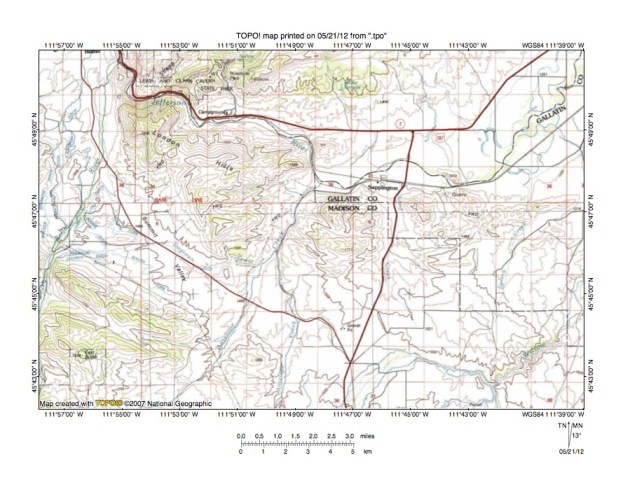 Figure 1: Jefferson River-Madison River drainage divide area location map (select and click on maps to enlarge). National Geographic Society map digitally presented using National Geographic Society TOPO software.