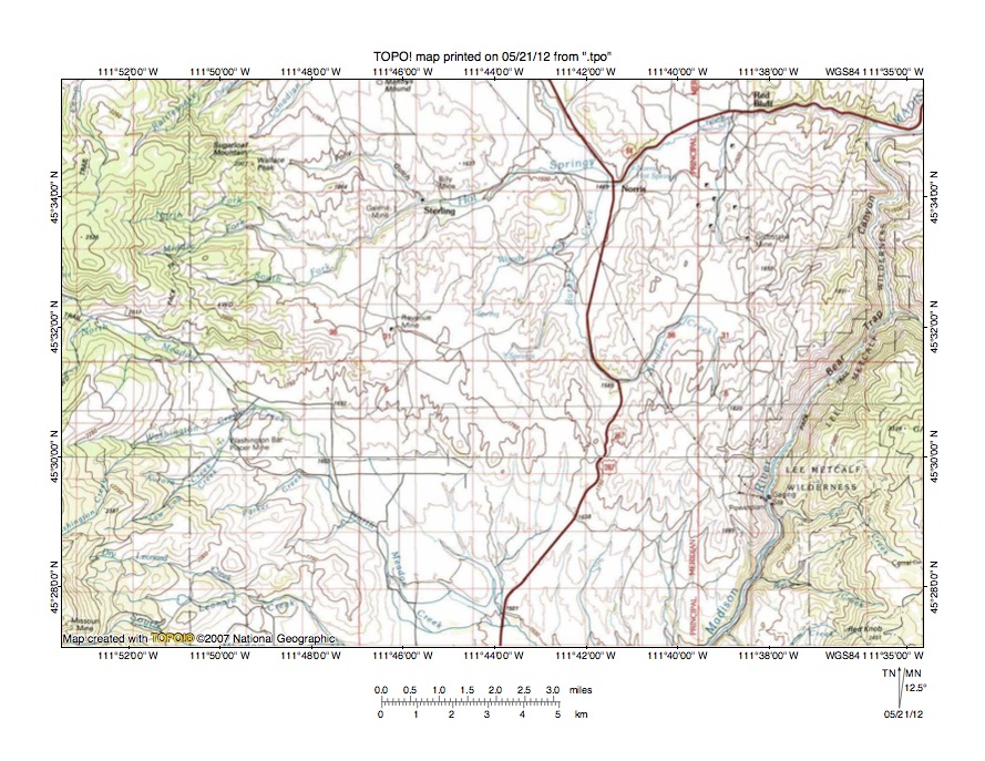 Figure 9: South Boulder River-North Meadow Creek drainage divide area. United States Geological Survey map digitally presented using National Geographic Society TOPO software.