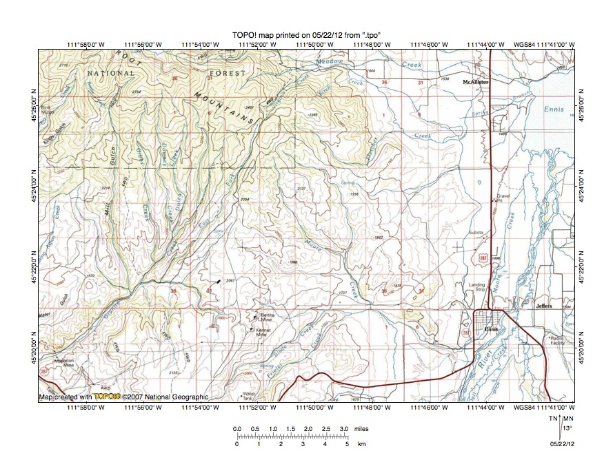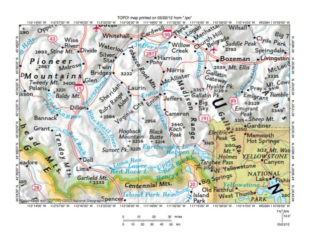 Figure 1. Ruby River-Madison River drainage divide area location map (select and click on maps to enlarge). National Geographic Society map digitally presented using National Geographic Society TOPO software.