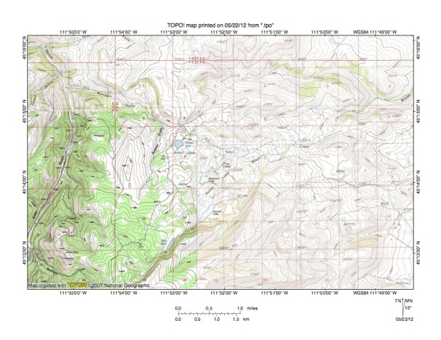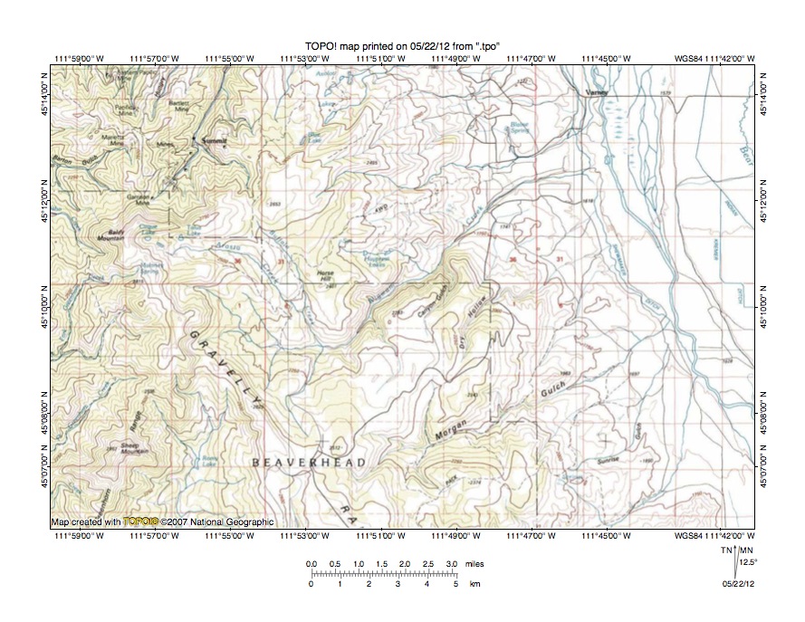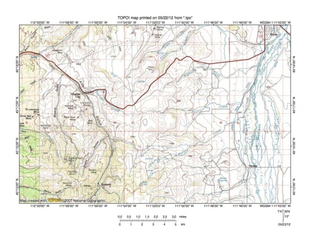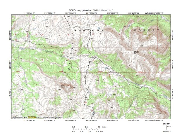 Figure 5: Alder Gulch-Moran Creek drainage divide area. United States Geological Survey map digitally presented using National Geographic Society TOPO software.