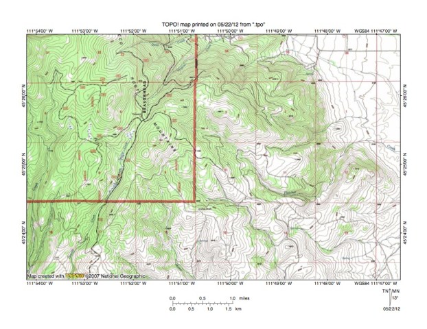 Figure 7. Alder Gulch-Wigwam Creek drainage divide area. United States Geological Survey map digitally presented using National Geographic Society TOPO software.