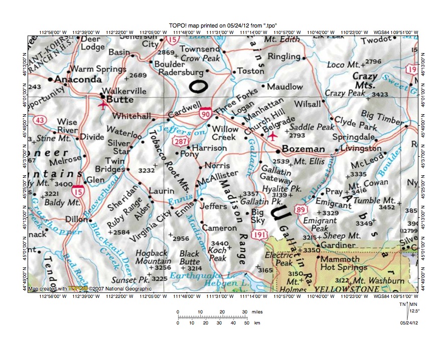 Figure 1: Madison River-Gallatin River drainage divide area location map (select and click on maps to enlarge). National Geographic Society map digitally presented using National Geographic Society TOPO software.