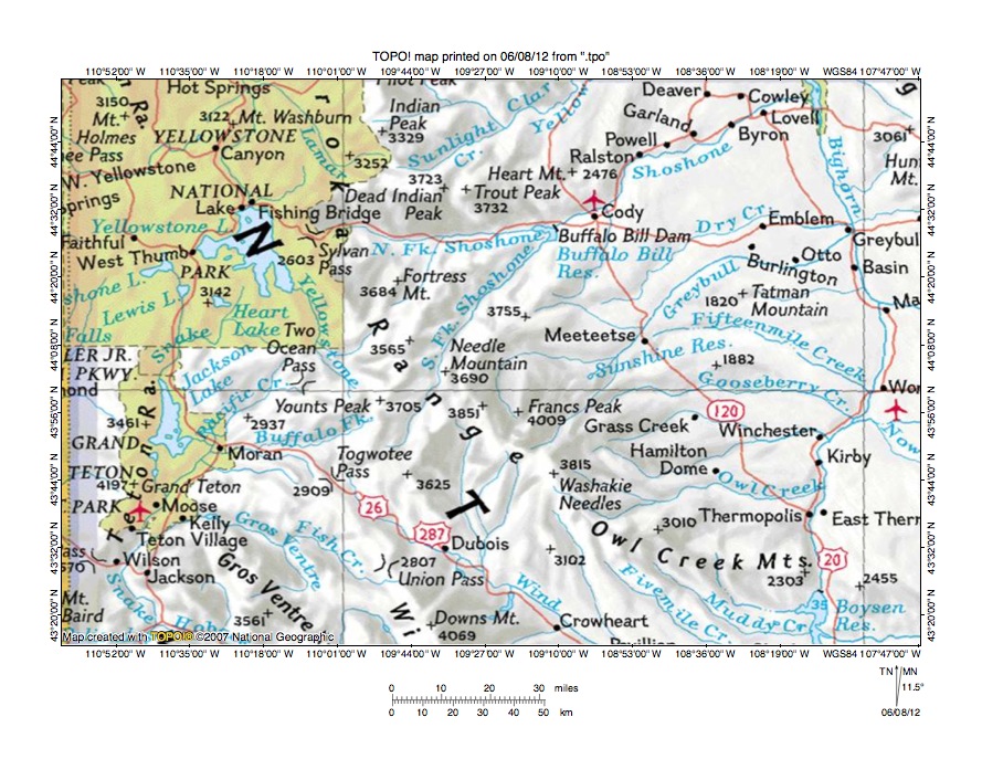 Figure 1: Yellowstone River-Pacific Creek drainage divide area location map (select and click on maps to enlarge). National Geographic Society map digitally presented using National Geographic Society TOPO software.