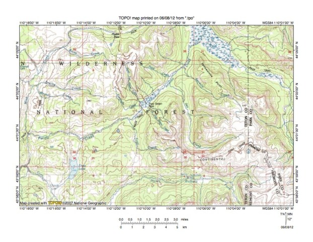 Figure 9: Yellowstone River-Lake Creek drainage divide area. United States Geological Survey map digitally presented using National Geographic Society TOPO software.