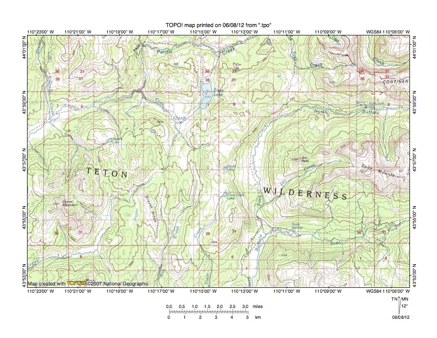 Figure 7: Pacific Creek-Buffalo Creek drainage divide area. United States Geological Survey map digitally presented using National Geographic Society TOPO software.