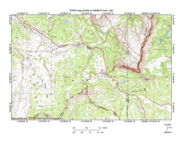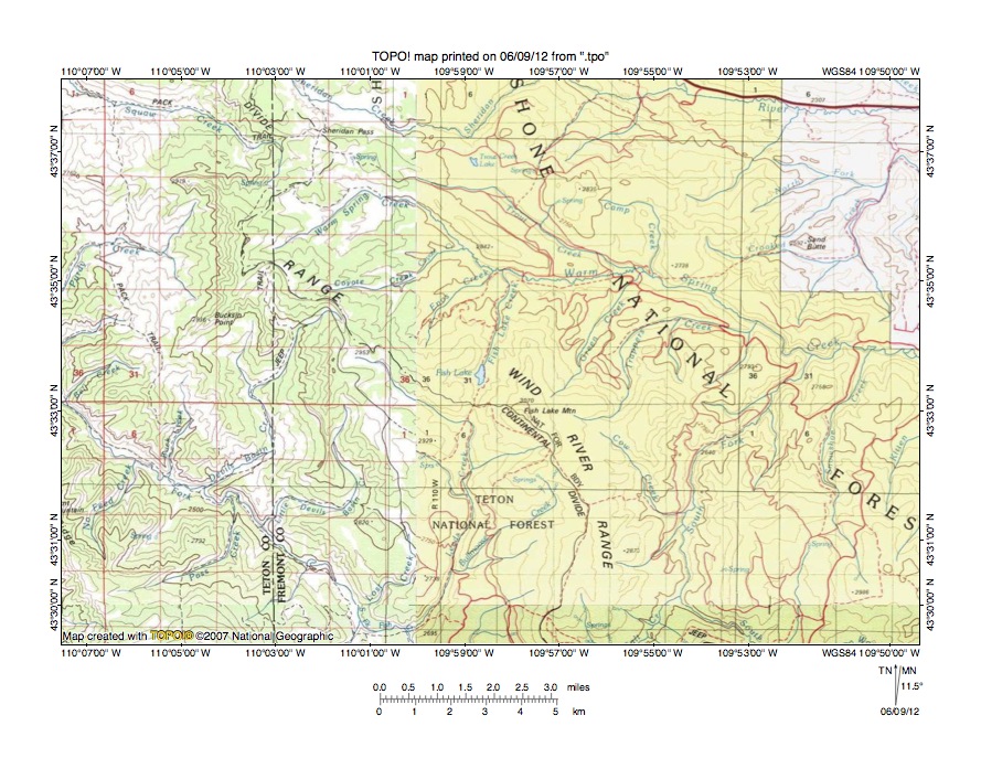 Figure 1: Snake River-Wind River drainage divide area location map (select and click on maps to enlarge). National Geographic Society map digitally presented using National Geographic Society TOPO software.