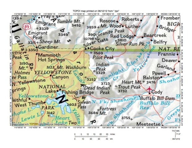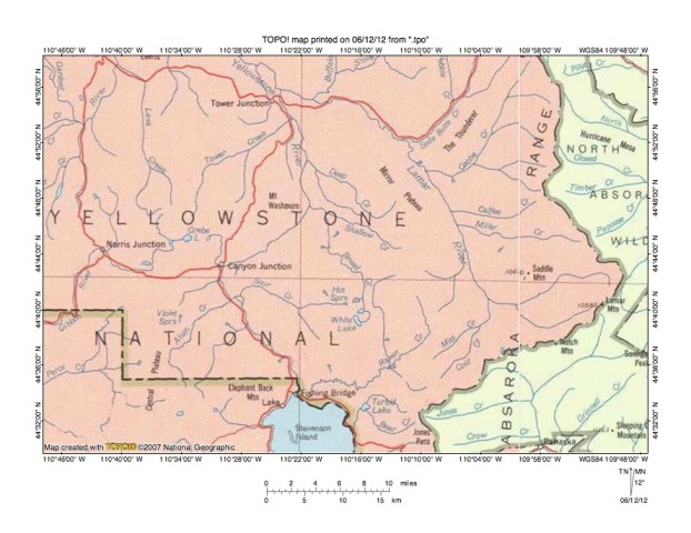 Figure 1: Yellowstone River-Lamar River drainage divide area location map (select and click on maps to enlarge). National Geographic Society map digitally presented using National Geographic Society TOPO software.