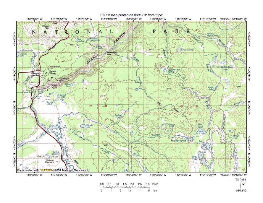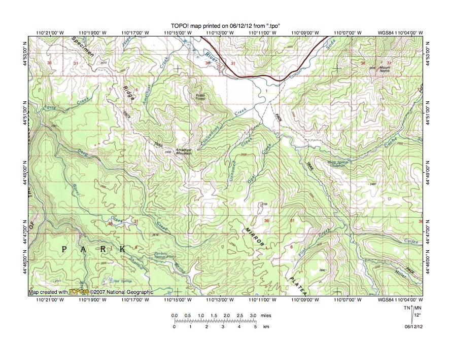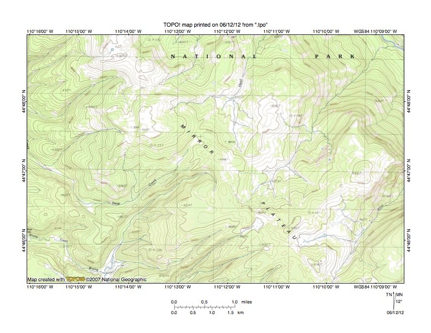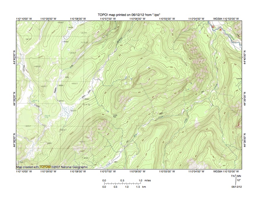 Figure 3: Lamar River-Wrong Creek drainage divide area. United States Geological Survey map digitally presented using National Geographic Society TOPO software.