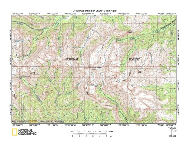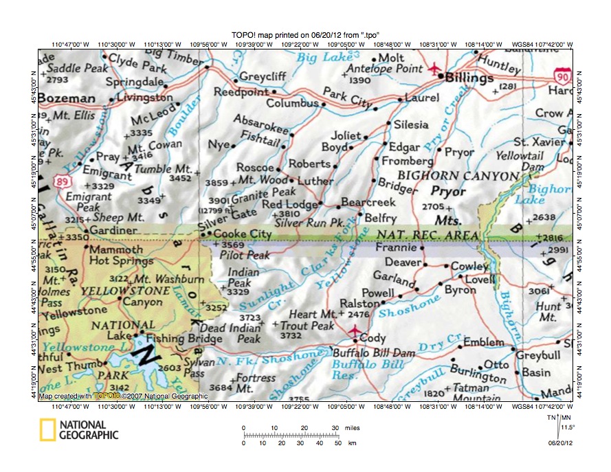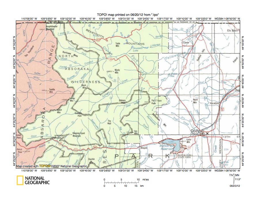 Figure 1: Clarks Fork Yellowstone River-Shoshone River drainage divide area location map (select and click on maps to enlarge). National Geographic Society map digitally presented using National Geographic Society TOPO software.