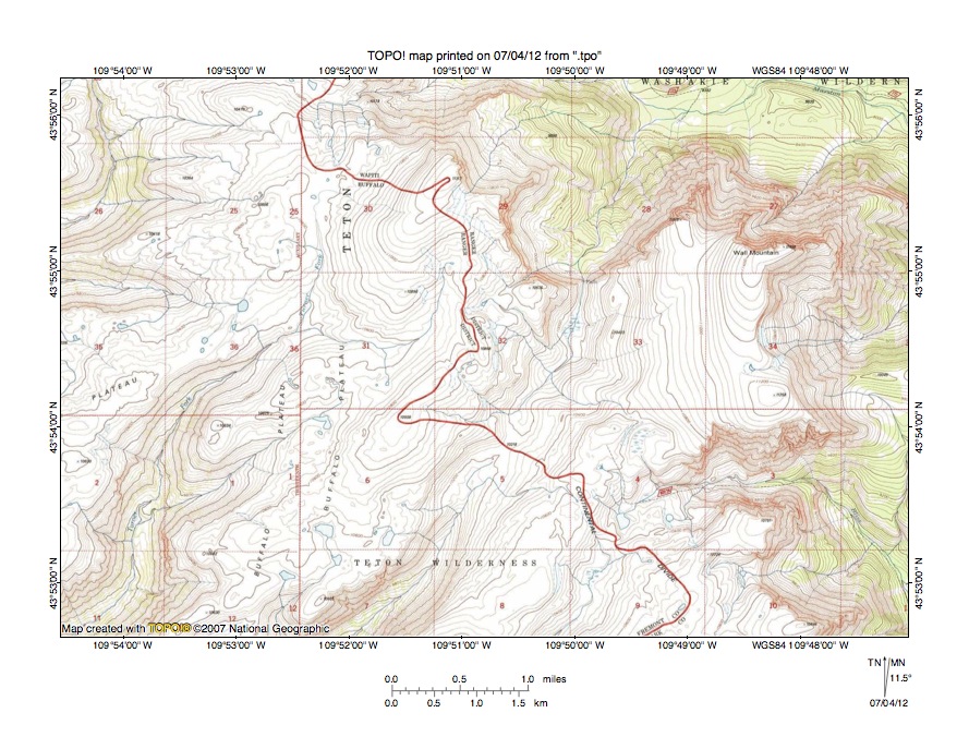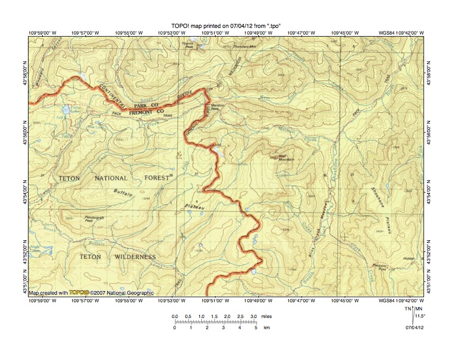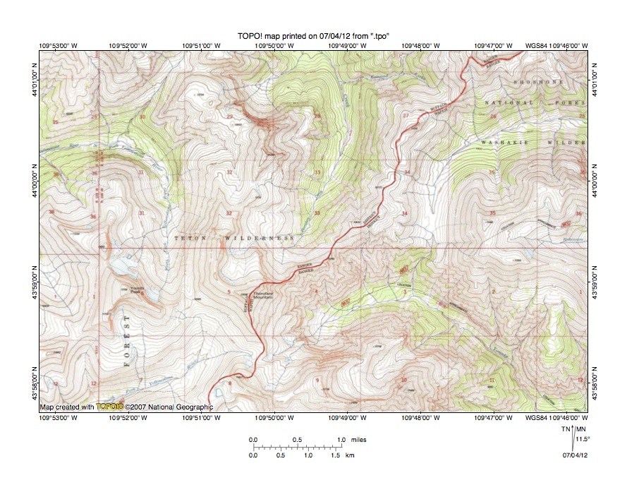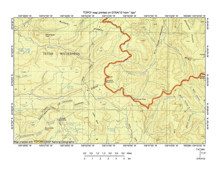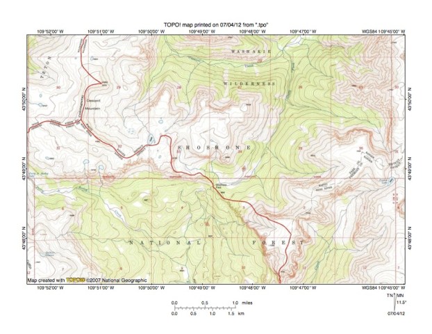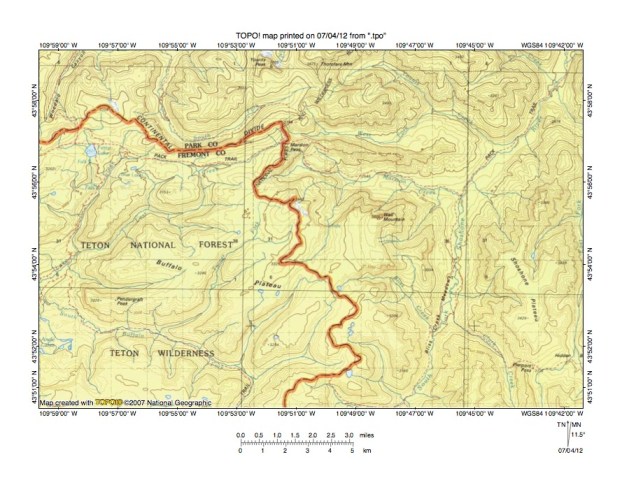 Figure 5: South Fork Shoshone River-South Buffalo Fork drainage divide area. United States Geological Survey map digitally presented using National Geographic Society TOPO software.