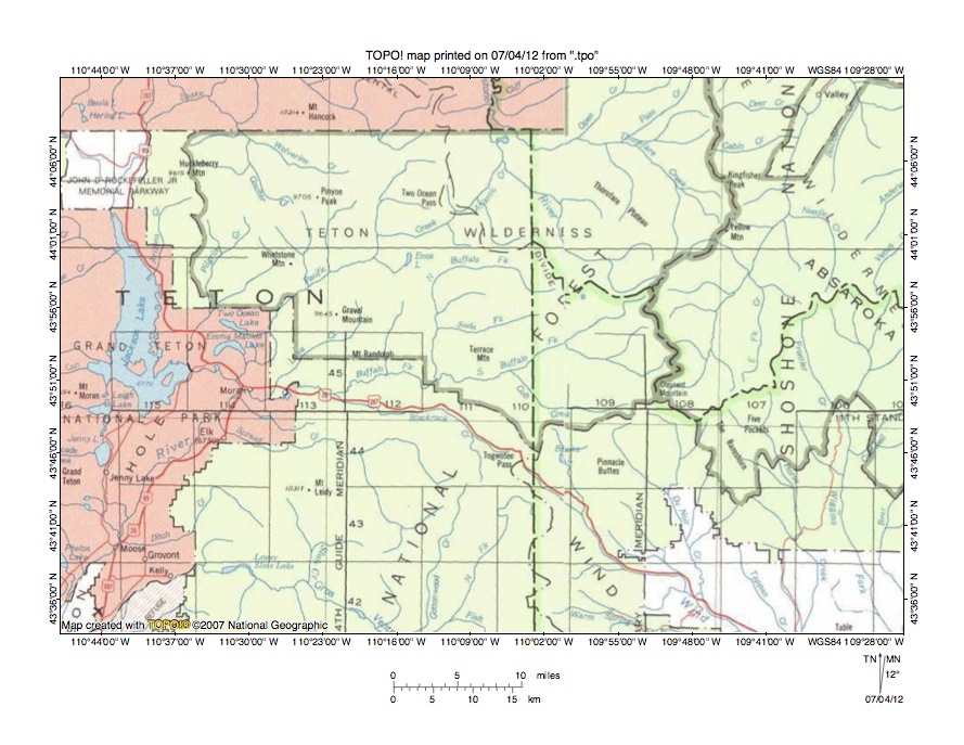 Figure 1: South Fork Shoshone River-Snake River drainage divide area location map (select and click on maps to enlarge). National Geographic Society map digitally presented using National Geographic Society TOPO software.