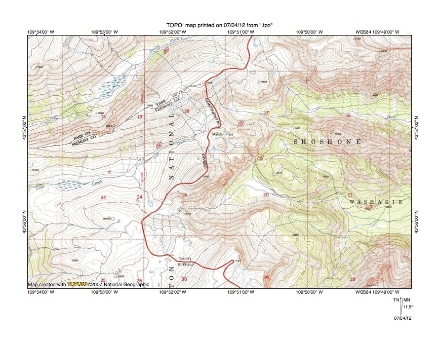 Figure 7: Detailed map of Marston Creek-South Buffalo Fork drainage divide area. United States Geological Survey map digitally presented using National Geographic Society TOPO software.