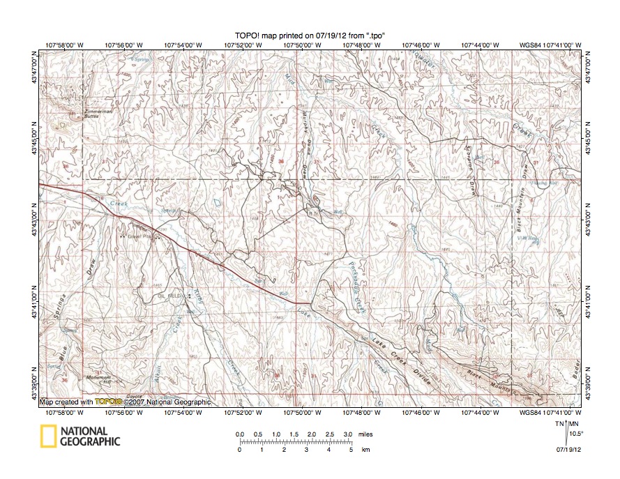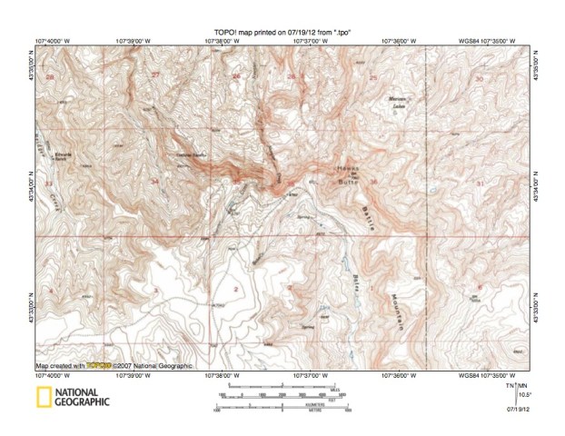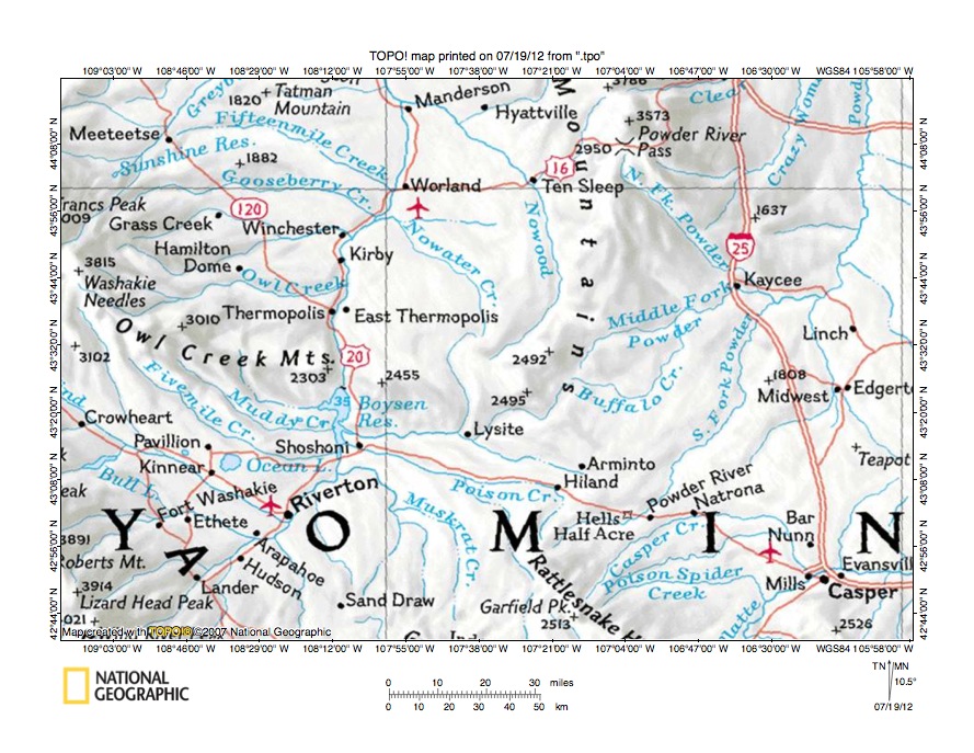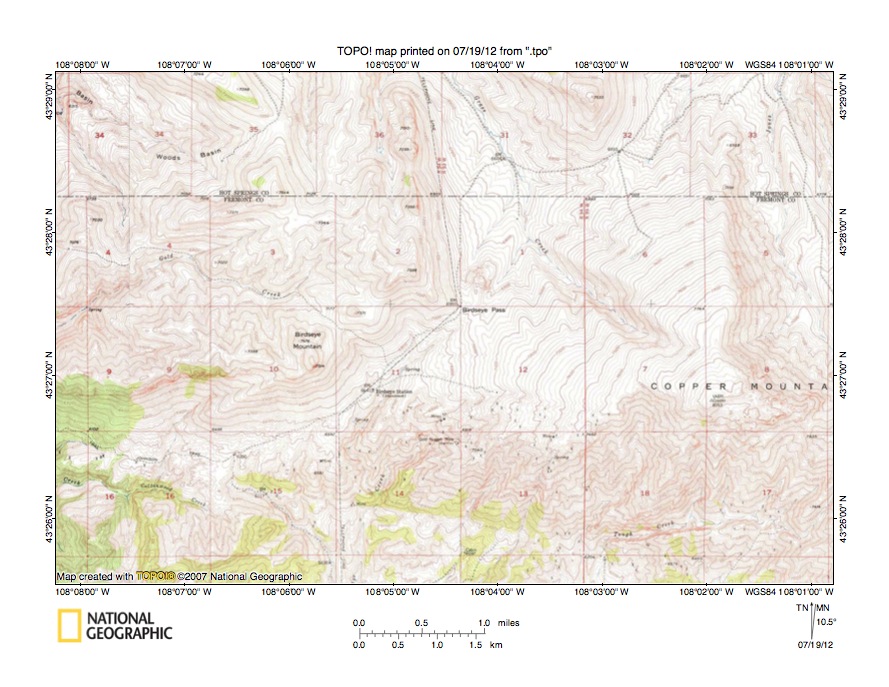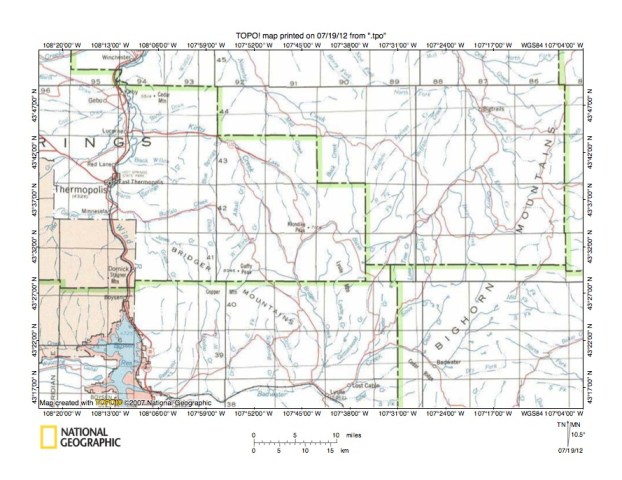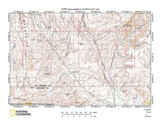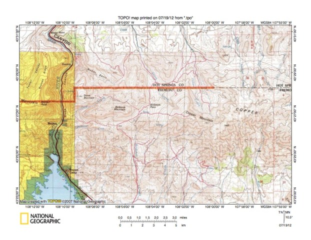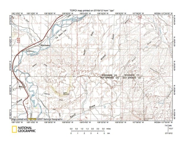 Figure 3: Grass Creek-Birdseye Creek drainage divide area near Wind River Canyon. United States Geological Survey map digitally presented using National Geographic Society TOPO software.