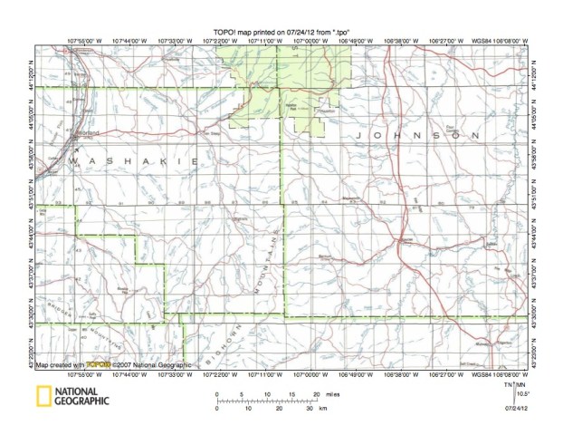 Figure 1: -Nowood River-Powder River drainage divide area location map (select and click on maps to enlarge). National Geographic Society map digitally presented using National Geographic Society TOPO software.