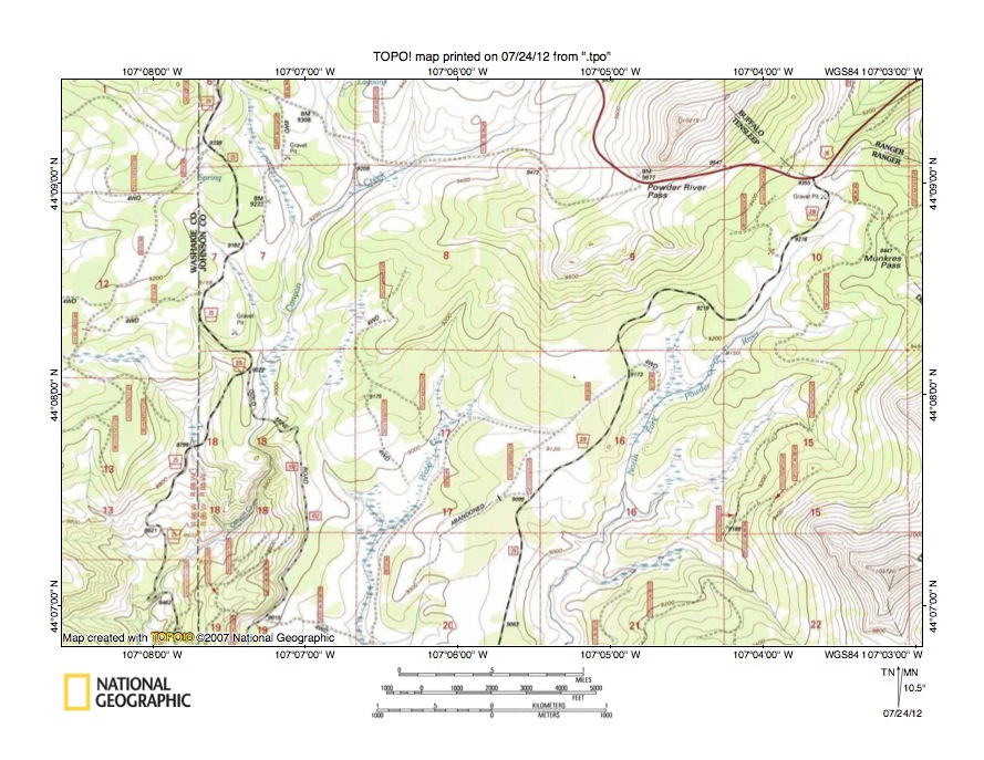 Figure 3: Canyon Creek-North Fork Powder River drainage divide area near Powder River Pass. United States Geological Survey map digitally presented using National Geographic Society TOPO software.