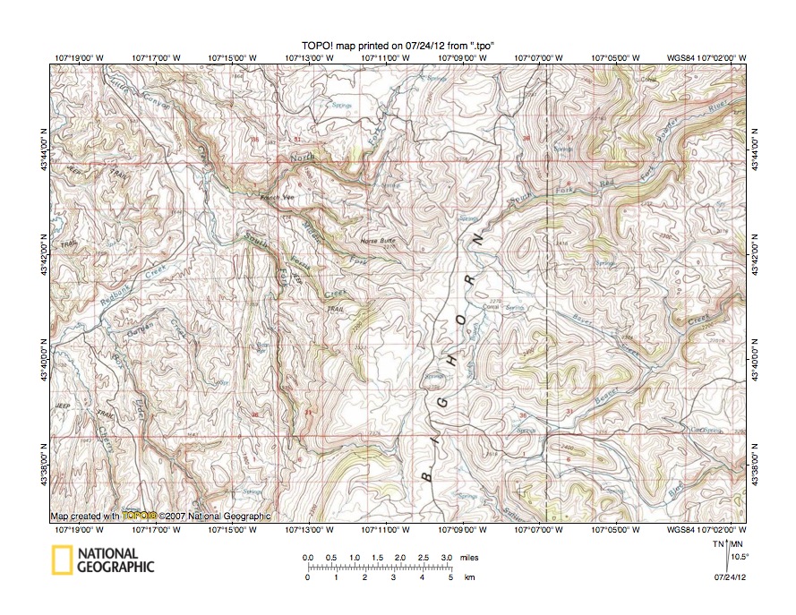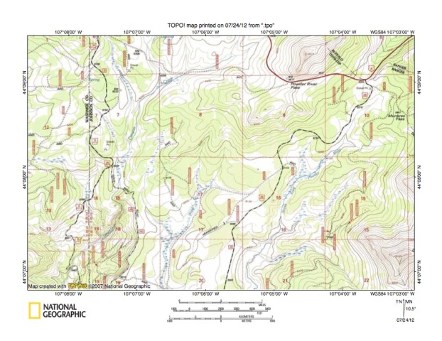 Figure 10: Deep Creek-Middle Fork Powder River drainage divide area. United States Geological Survey map digitally presented using National Geographic Society TOPO software.