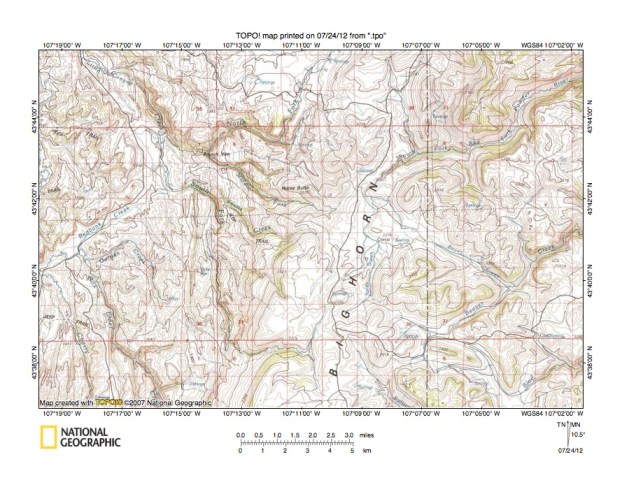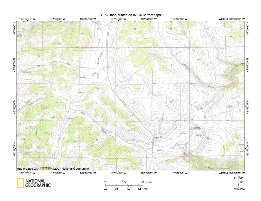 Figure 5: North Fork Powder River-Billy Creek drainage divide area. United States Geological Survey map digitally presented using National Geographic Society TOPO software.