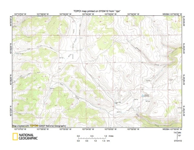Figure 9: Little Canyon Creek-South Fork Red Fork Powder River drainage divide area. United States Geological Survey map digitally presented using National Geographic Society TOPO software.