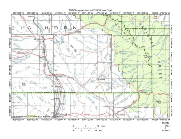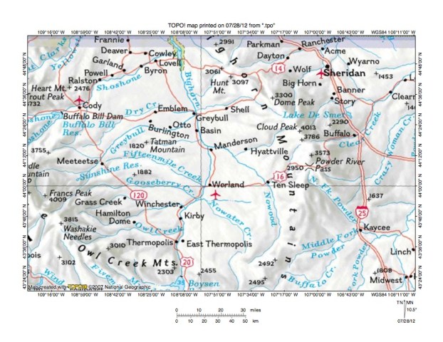 Figure 1: Shell Creek-Nowood River drainage divide area location map (select and click on maps to enlarge). National Geographic Society map digitally presented using National Geographic Society TOPO software.