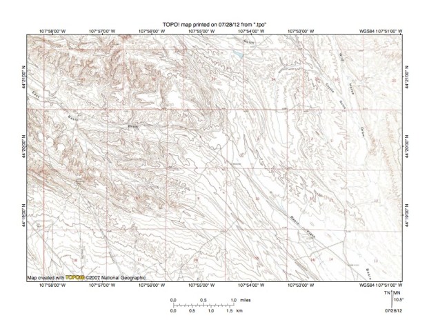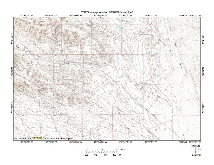 Figure 9: East Basin Draw-Nowood River drainage divide area. United States Geological Survey map digitally presented using National Geographic Society TOPO software.