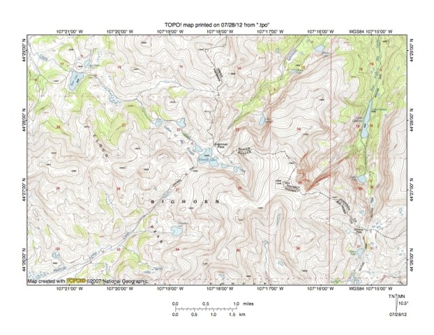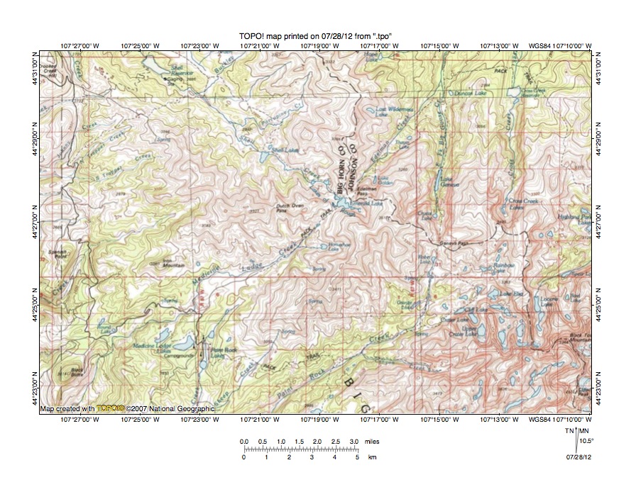 Figure 2: Detailed location map Shell Creek-Nowood River drainage divide area. United States Geological Survey map digitally presented using National Geographic Society TOPO software.