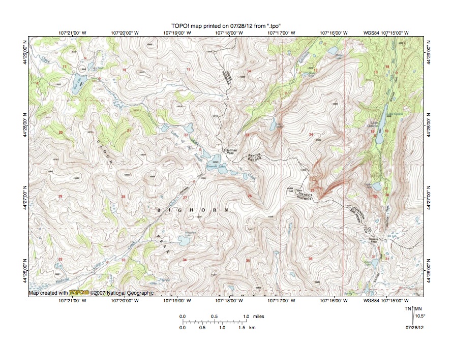 Figure 4 provides a detailed topographic map of the Shell Creek-Medicine Lodge Creek drainage divide seen in less detail in figure 3. The map contour interval for figure 4 is 40 feet. Emerald Lake is located at the center of figure 4. Shell Creek flows in a northwest direction from Emerald Lake to the northwest corner of figure 4 and then to the Bighorn River west of the Bighorn Mountains. The Edelman Trail extends in a southwest direction from Emerald Lake to the southwest oriented Medicine Lodge Creek valley, with Medicine Lodge Creek flowing to the southwest corner of figure 4. Medicine Lodge Creek flows to Paint Rock Creek, which then flows to the Nowood River west of the Bighorn Mountains. The Edelman Trail crosses the Shell Creek-Medicine Lake Creek drainage divide via a pass with an elevation of 10,465 feet. A high point in the northeast corner of section 28 to the west rises to 10,958 feet and elevations east of the pass rise to more than 11,000 feet suggesting the pass is almost 500 feet deep. North of Emerald Lake is Edelman Pass, which links the Shell Creek valley with the north-northeast oriented Edelman Creek valley, with Edelman Creek flowing to the north edge of figure 4 (east half) and then to the east side of the Bighorn Mountains. The Edelman Pass elevation is only slightly higher than the Emerald Lake elevation of 10,250 feet. Elevations in the northeast corner of section 15 rise to 11,044 feet and elevations to the east of Edelman Pass rise even higher suggesting Edelman Pass is as much as 800 feet deep. Geneva Pass is located in section 31 near the southeast corner of figure 4 and links the north oriented East Fork Big Goose Creek valley with a south oriented Paint Rock Creek tributary valley. South of figure 4 Paint Rock Creek flows in a southwest direction and eventually joins Nowood River. The Geneva Pass elevation is between 10,240 and 10,280 feet. Elevations in section 25 rise to 11,540 feet and elevations greater than 11,600 feet are found east of figure 4. These elevations suggest Geneva Pass is more than 1100 feet deep. Study of figure 4 reveals many other passes crossing the various drainage divides. These passes are all water-eroded features and were eroded by floodwaters crossing the region prior to emergence of the Bighorn Mountains as a high mountain range. Floodwaters initially flowed in south directions to the actively eroding Paint Rock Creek and tributary valleys, although the reversal of flood flow in the Tongue River drainage basin east of the emerging Bighorn Mountains captured southeast oriented flood flow moving on the present day northwest oriented Shell Creek alignment. A reversal of flood flow west of the emerging Bighorn Mountains caused a reversal of flood flow on the Shell Creek alignment, which then created the northwest oriented Shell Creek drainage route.