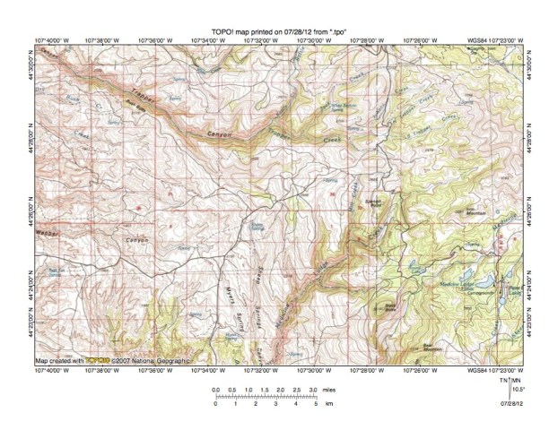 Figure 6: Detailed map of Trapper Creek-Medicine Lodge Creek drainage divide area. United States Geological Survey map digitally presented using National Geographic Society TOPO software.