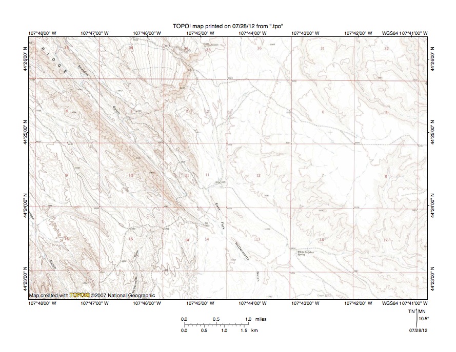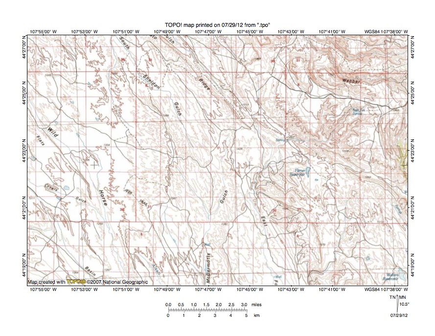 Figure 4: Detailed map of Shell Creek-Medicine Lodge Creek drainage divide area. United States Geological Survey map digitally presented using National Geographic Society TOPO software.