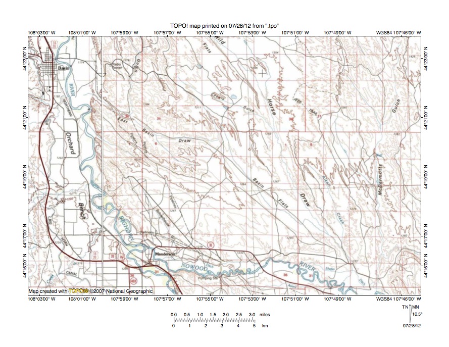 Figure 9 illustrates the East Basin Draw-Nowood River drainage divide area west and south of figure 8 and includes an overlap area with figure 8. Basin is the town near the northwest corner of figure 9 and Manderson is the smaller town in the southwest quadrant of figure 9. The Bighorn River flows in a north-northwest and north direction from the south edge of figure 9 (near Manderson) to the north edge of figure 9 (near Basin). The Nowood River flows in a west-northwest and west direction from the south edge of figure 9 (east half) to join the Bighorn River near Manderson. McDermotts Draw is a south oriented Nowood River tributary near the east edge of figure 9. Wild Horse Draw is a south-southeast oriented Nowood River tributary draining from the north edge of figure 9 (slightly west of center) to join the Nowood River near the south edge of figure 9 (near where McDermotts Draw joins the Nowood River). East Basin Draw is a northwest oriented drainage route joining the north oriented Bighorn River a short distance south of Basin. Basin Flats is located directly to the southeast of East Basin Draw and is drained by a southeast oriented Wild Horse Draw tributary. A through valley links the northwest oriented East Basin Draw valley with the southeast oriented Basin Flats valley. The map contour interval for figure 9 is 20 meters and the through valley floor elevation is between 1260 and 1280 meters. Elevations on either side of the through valley rise to more than 1340 meters suggesting the through valley is at least 60 meters deep. Compared to the Bighorn Mountains this through valley is almost insignificant, yet the through valley provides evidence of a former southeast oriented flood flow channel that was eroded prior to the reversal of flood flow in the Bighorn Basin. The southeast oriented flood flow was moving from the present day north oriented Bighorn River valley to the present day north and northwest oriented Nowood River valley (south and east of figure 9). Unlike figures 7 and 8 the East Basin Draw-Basin Flats through valley does not appear to be located between two hogback ridges and probably its orientation was probably not defined by any underlying geologic structures