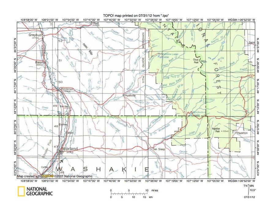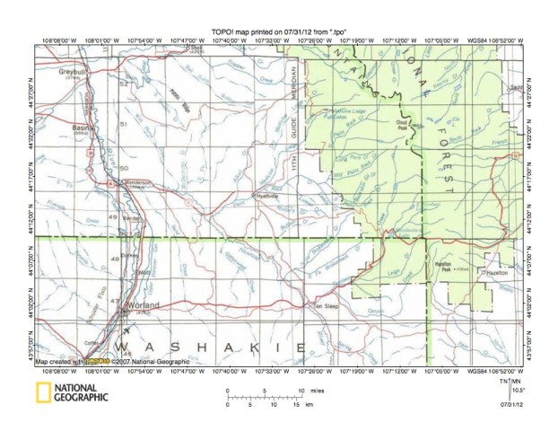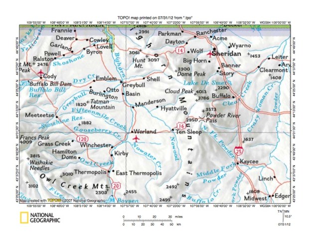 Figure 1: Paint Rock Creek-Tensleep Creek drainage divide area location map (select and click on maps to enlarge). National Geographic Society map digitally presented using National Geographic Society TOPO software.