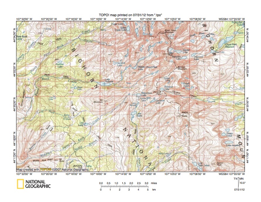Figure 5: South Paint Rock Creek-West Tensleep Creek drainage divide area. United States Geological Survey map digitally presented using National Geographic Society TOPO software.