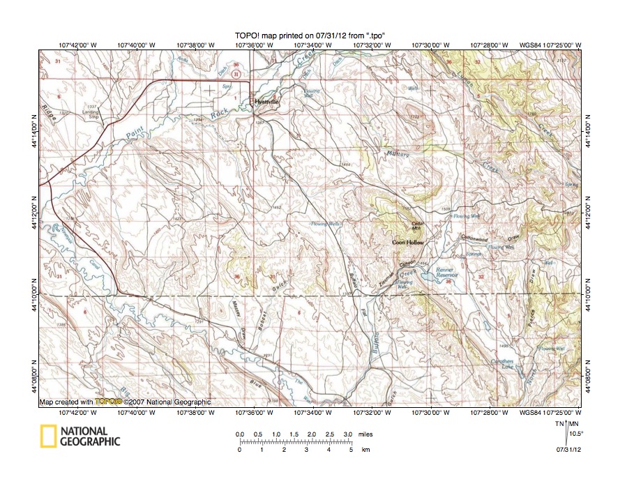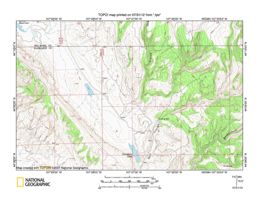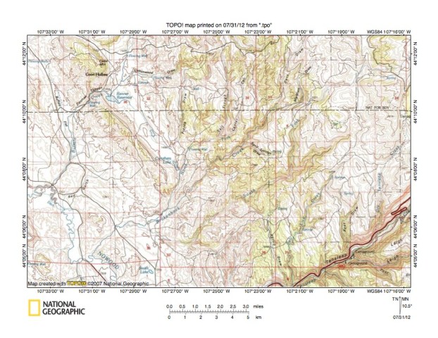 Figure 3: Paint Rock Creek-West Tensleep Creek drainage divide area. United States Geological Survey map digitally presented using National Geographic Society TOPO software.