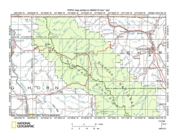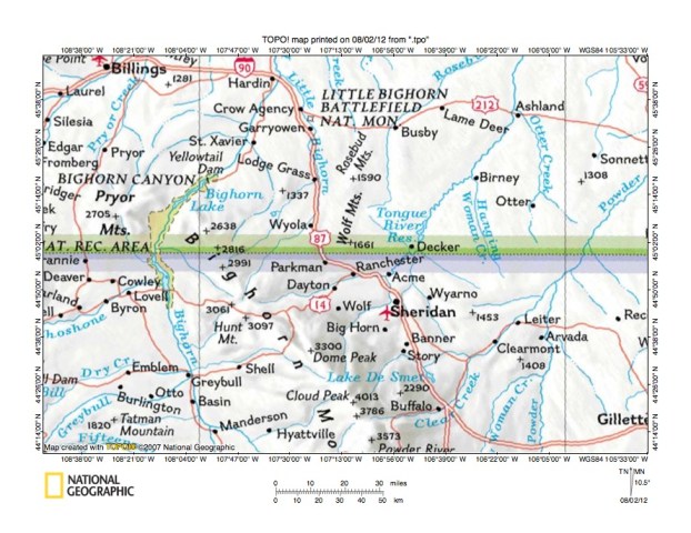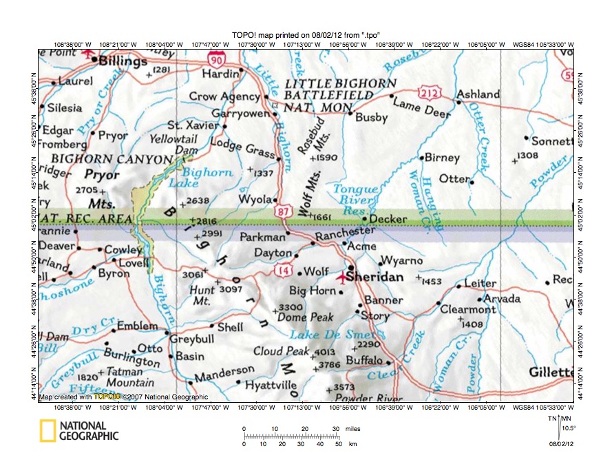 Figure 1: Tongue River-Shell Creek drainage divide area location map (select and click on maps to enlarge). National Geographic Society map digitally presented using National Geographic Society TOPO software.