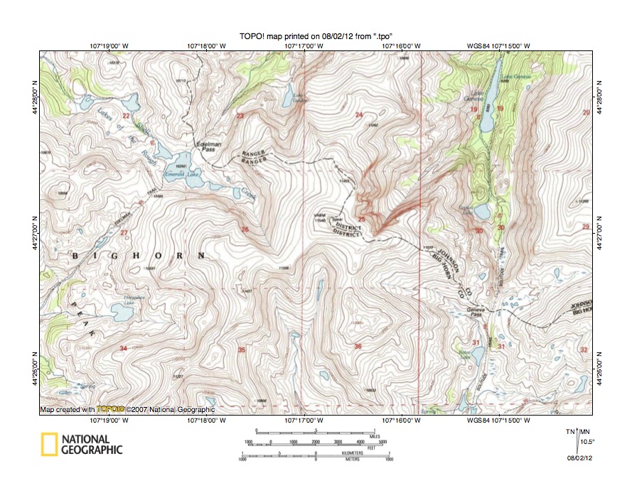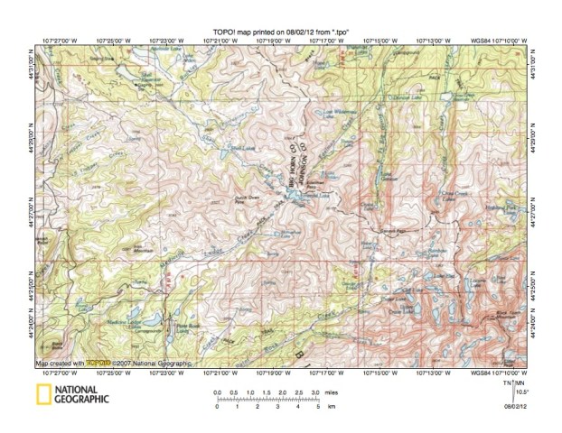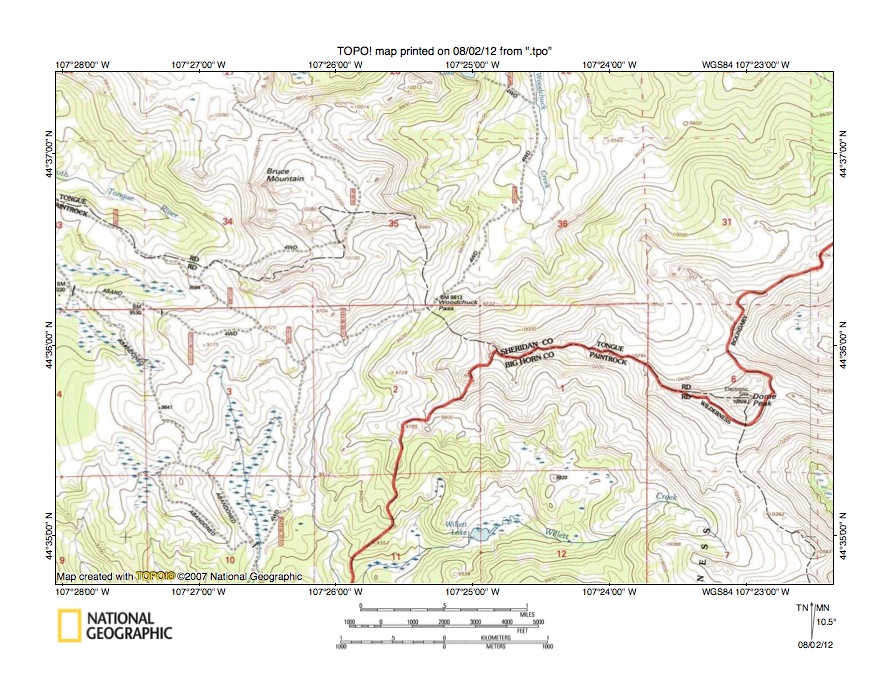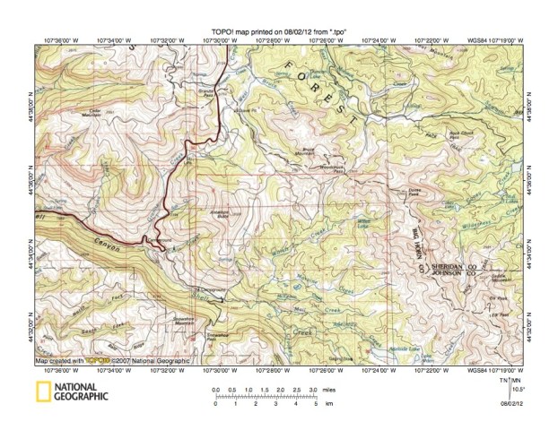 Figure 10: Detailed map of Dry Fork Little Bighorn River-North Tongue River drainage divide area. United States Geological Survey map digitally presented using National Geographic Society TOPO software.