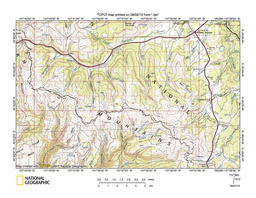 Figure 7: North Tongue River-Shell Creek drainage divide area. United States Geological Survey map digitally presented using National Geographic Society TOPO software.