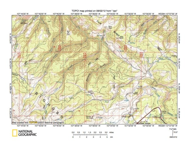 Figure 2: Detailed location map Tongue River-Shell Creek drainage divide area. United States Geological Survey map digitally presented using National Geographic Society TOPO software.