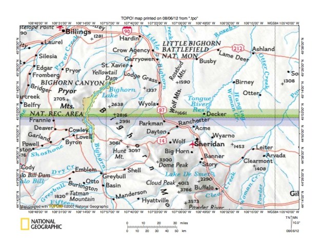 Figure 1: Tongue River-Goose Creek drainage divide area location map (select and click on maps to enlarge). National Geographic Society map digitally presented using National Geographic Society TOPO software.