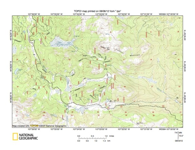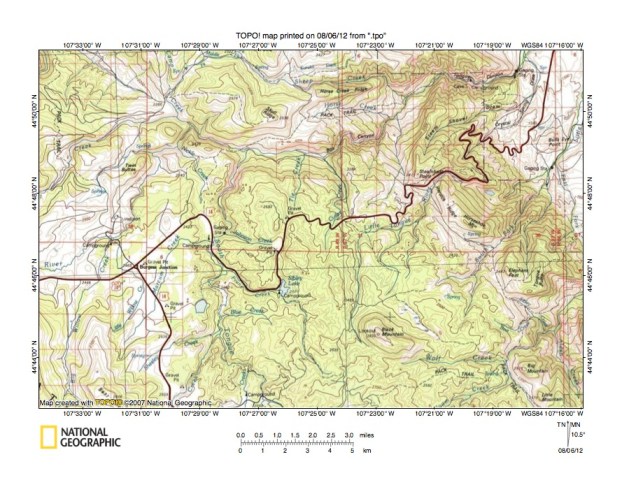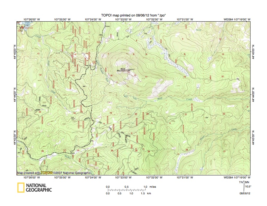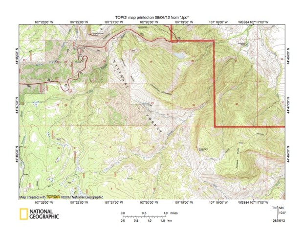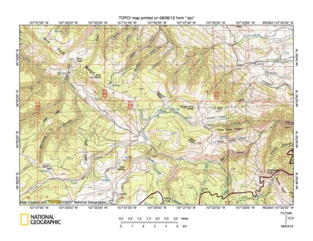 Figure 10: detailed map of East Fork South Tongue River-Sawmill Creek drainage divide area. United States Geological Survey map digitally presented using National Geographic Society TOPO software.