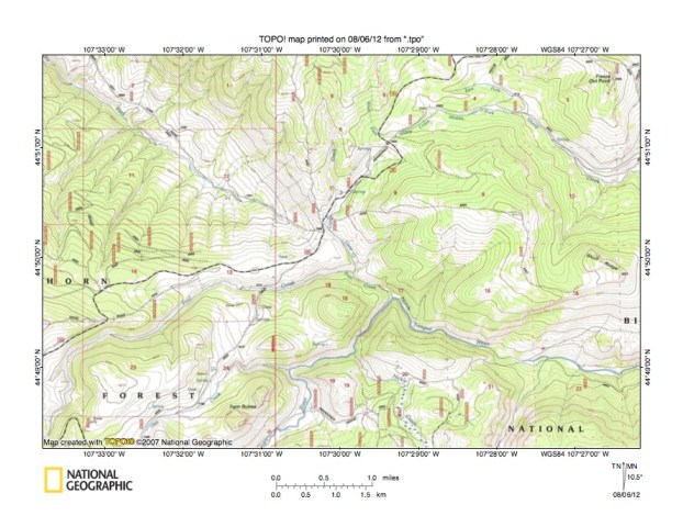 Figure 4: Detailed map of Dry Fork Little Bighorn River-North Tongue River drainage divide area. United States Geological Survey map digitally presented using National Geographic Society TOPO software.