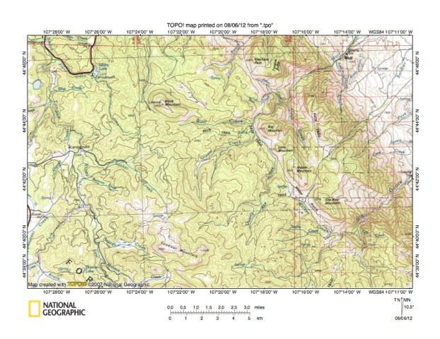 Figure 5: South Tongue River-Wolf Creek drainage divide area. United States Geological Survey map digitally presented using National Geographic Society TOPO software.
